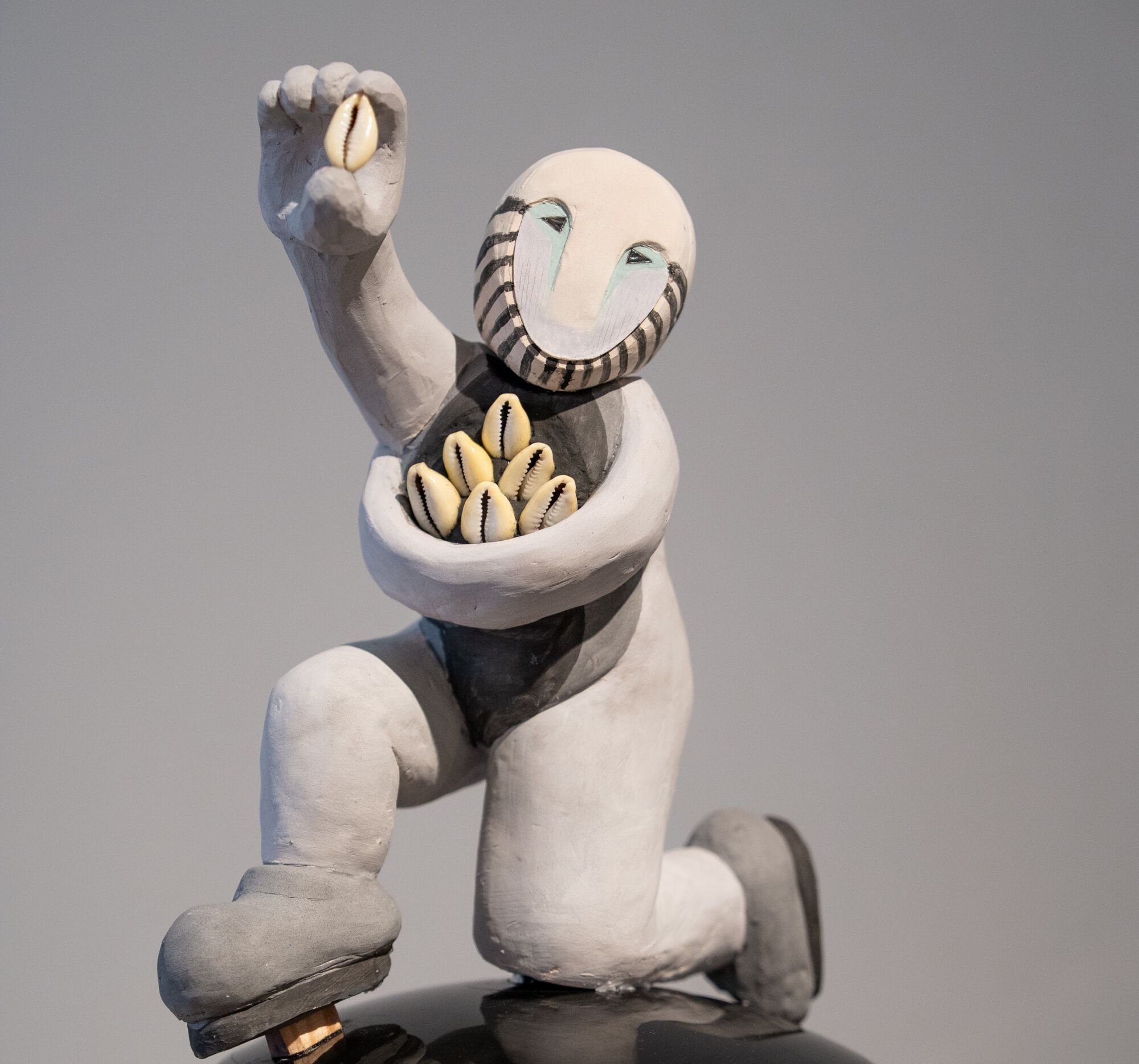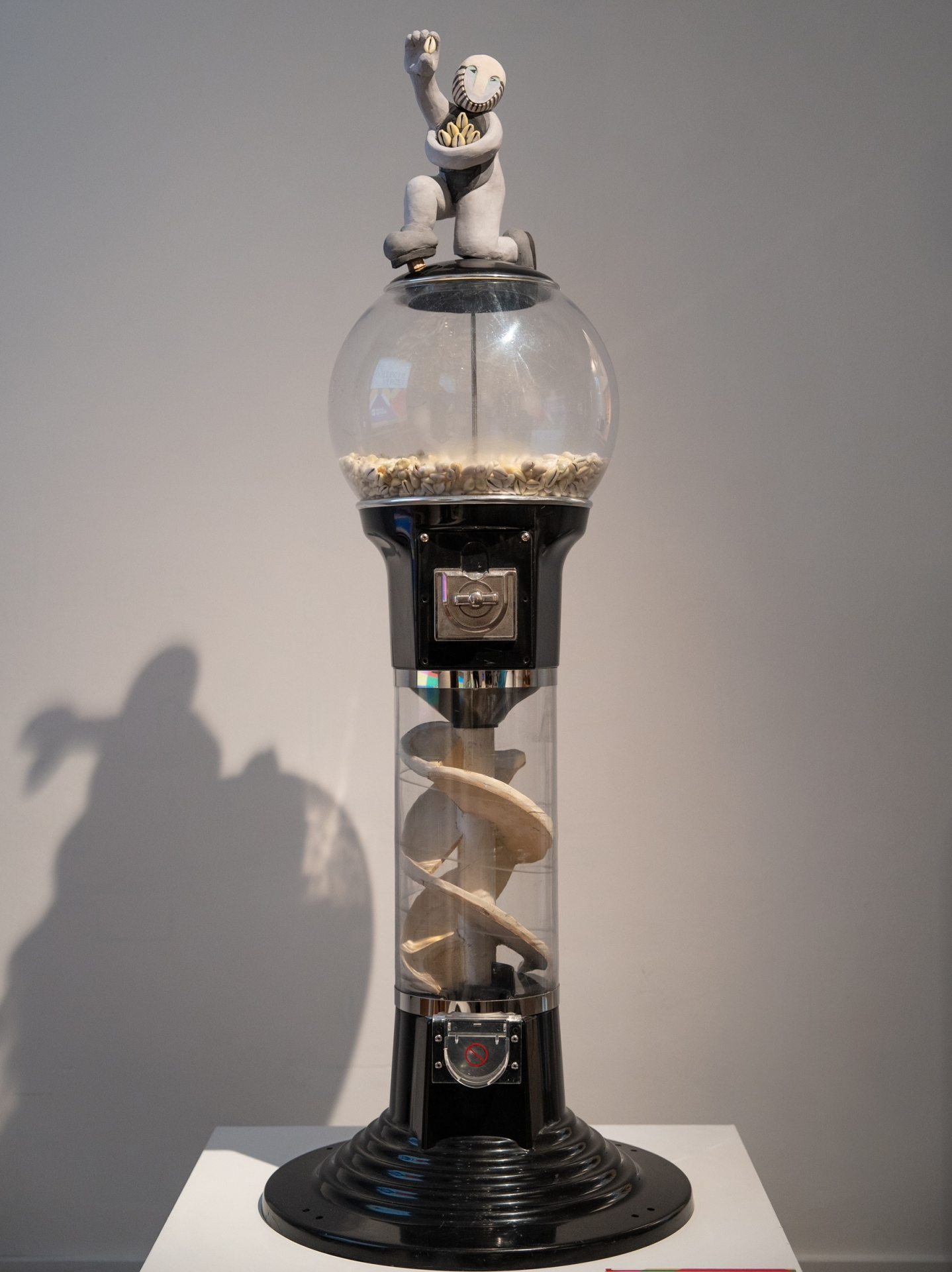 In dit werk vult Warre Mulder een kauwgomballenautomaat met kaurischelpen, ooit gebruikt als betaalmiddel en door de VOC ingezet bij de handel in tot slaafgemaakte mensen. Wat speels lijkt, opent een beladen geschiedenis en herwaardeert de schelpen als dragers van herinnering en bewustzijn.